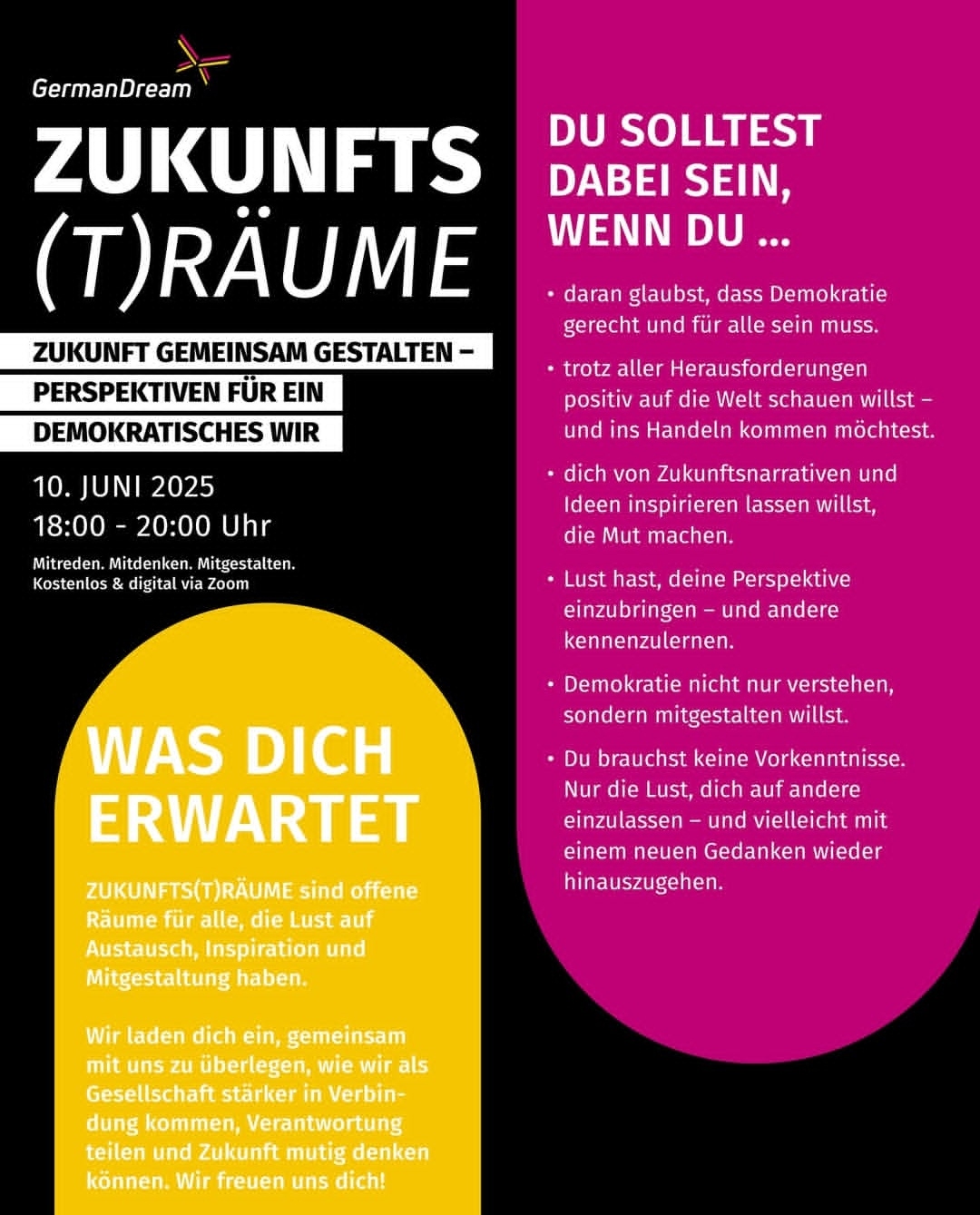 Anmeldung Zukunfts(t)räume: https://www.germandream.de/jams/jam1/